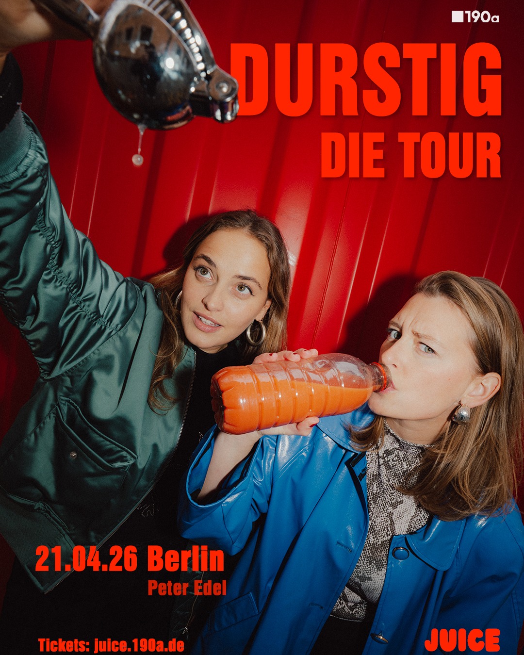 JUICE kommt live auf die Bühne und der Tea wird heißer als je zuvor! Mit „DURSTIG - Die Tour” bringen Lea und Lina ihren Podcast endlich auf die Bühne. Wer die beiden kennt, weiß: Wenn es irgendwo richtig guten JUICE gibt, dann wird er hier besprochen. Jeden Donnerstag gibt es eine neue Folge mit einer echten, juicy Geschichte aus ihrer Community. Ob Drama im Sportverein, heimliche Liebeleien am Arbeitsplatz oder Streitereien in der Nachbarschaft - Lea und Lina schenken euch nur den allerfeinsten JUICE ein. Jetzt werden die wildesten Storys gemeinsam mit dem Publikum durchleuchtet. Freut euch auf einen Abend voller Lacher, Drama und vor allem ganz viel JUICE. Wer schon lange durstig ist: Hier wird ordentlich JUICE gepresst!