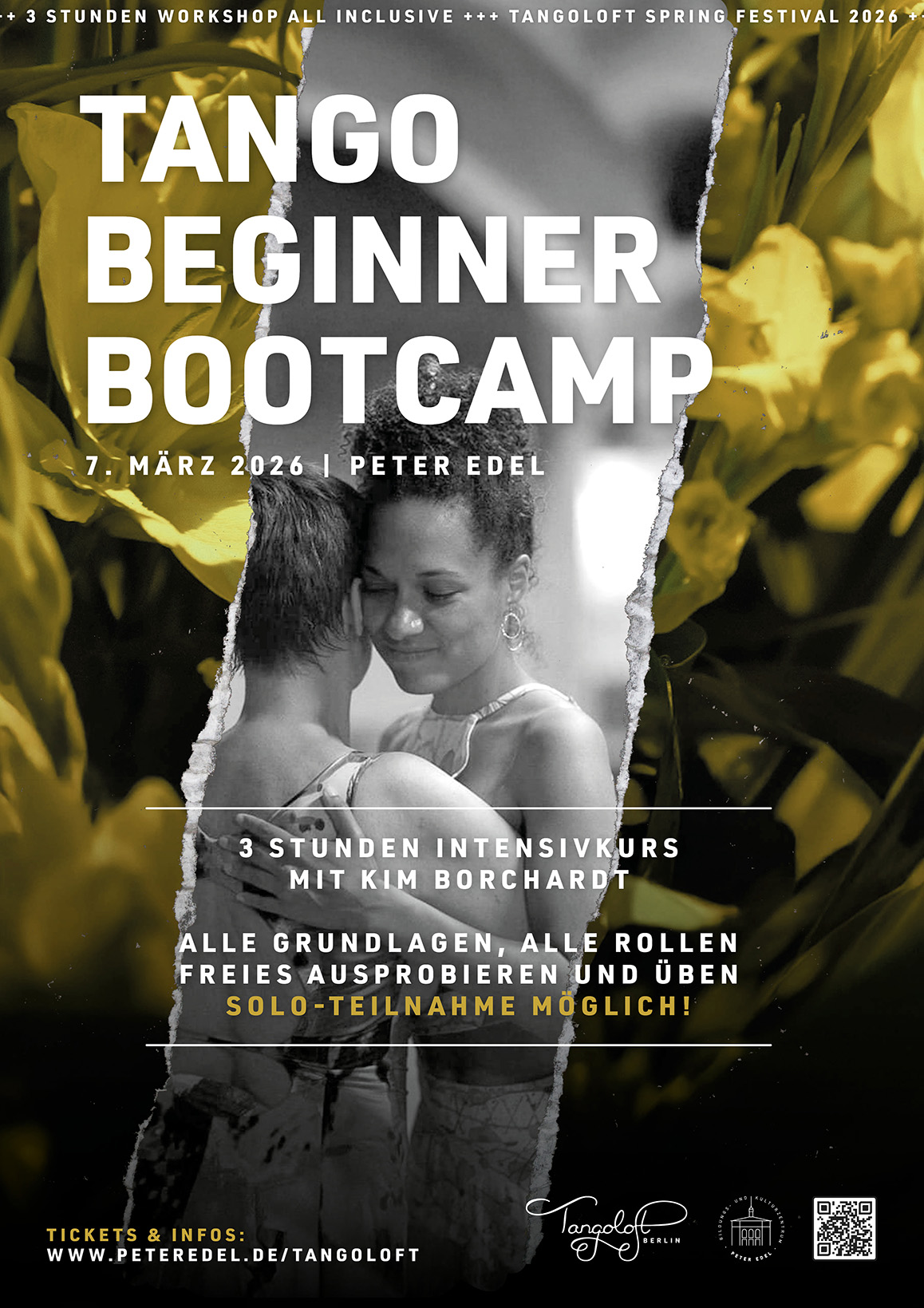 Tee und Wasser werden vor Ort bereit gestellt und sind im Preis inklusive. Im Anschluss an den Intensivkurs findet eine Practica statt, welche Euch direkt für die erste Milonga des Tangoloft Spring Festival 2026 warm macht. Hier könnt Ihr Euch mit erfahrenen Tänzerinnen und Tänzern vernetzen und Teil der wunderschönen Berliner Tango-Community werden (Tickets separat erhältlich).